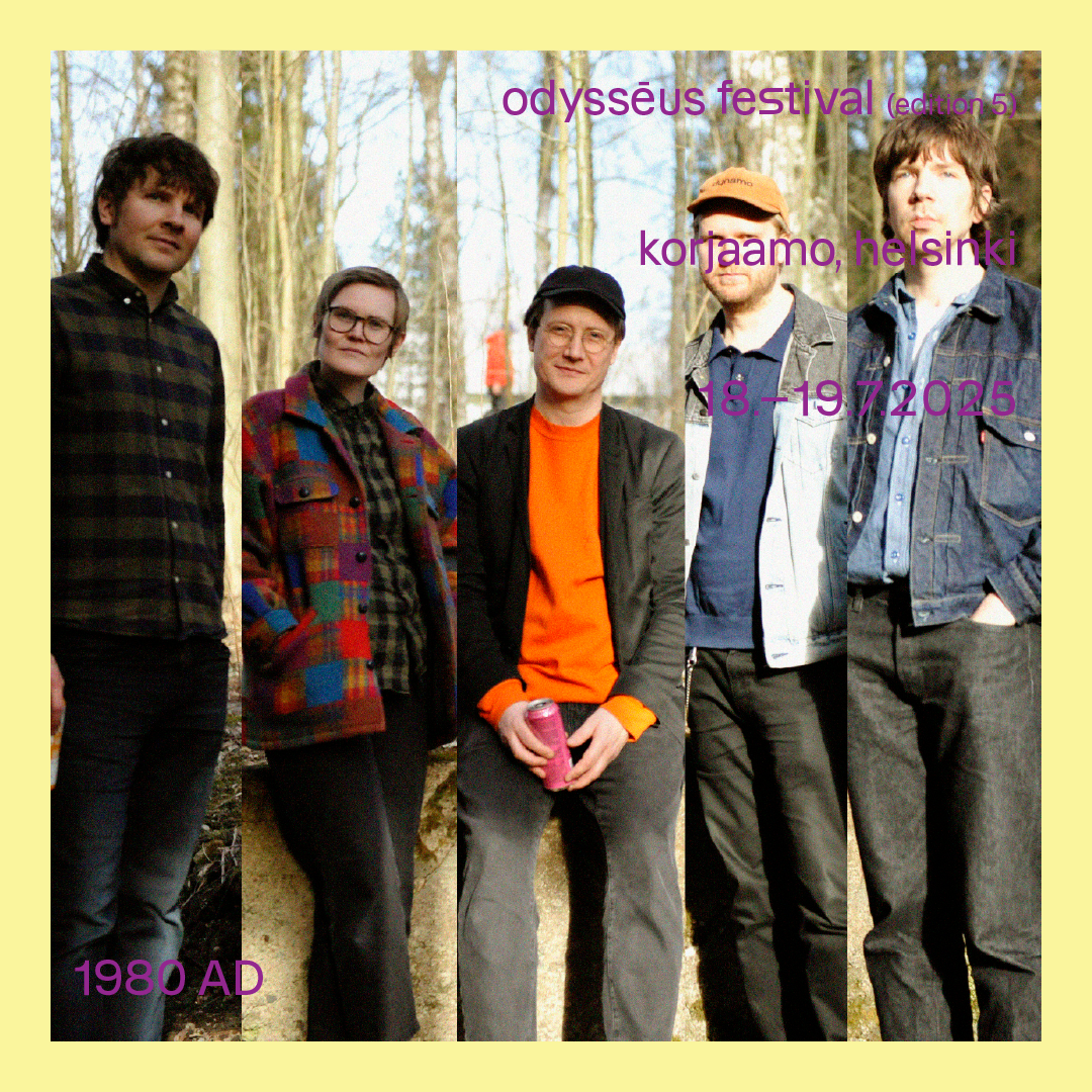 Transcendental and dreamy psychedelic folk rock and jangly guitar pop, blessed with noisy textures on top. 1980 AD started as a Finnish-language solo project of Aki Pohjankyrö (formerly of the shoegazey guitar outfit Black Twig), but quickly escalated into a full band form, with improvisation and group dynamics shaping the songs in new directions. They released their debut album Lasipallo, pahvikallo (“Glass sphere, cardboard skull”) earlier this spring, with lyrical themes, for example, of belonging to a place and a body, and dreaming up alternative realities in this time of looming politics and ecocatastrophes. Their fresh live quintet consists of Maiju Jouppi (monosynth, sampler, backing vox), Aki Pohjankyrö (vocals, guitar), Jussi Puukka (bass), Mikko Sulonen (guitar), and Rasmus Rantanen (drums, percussions).